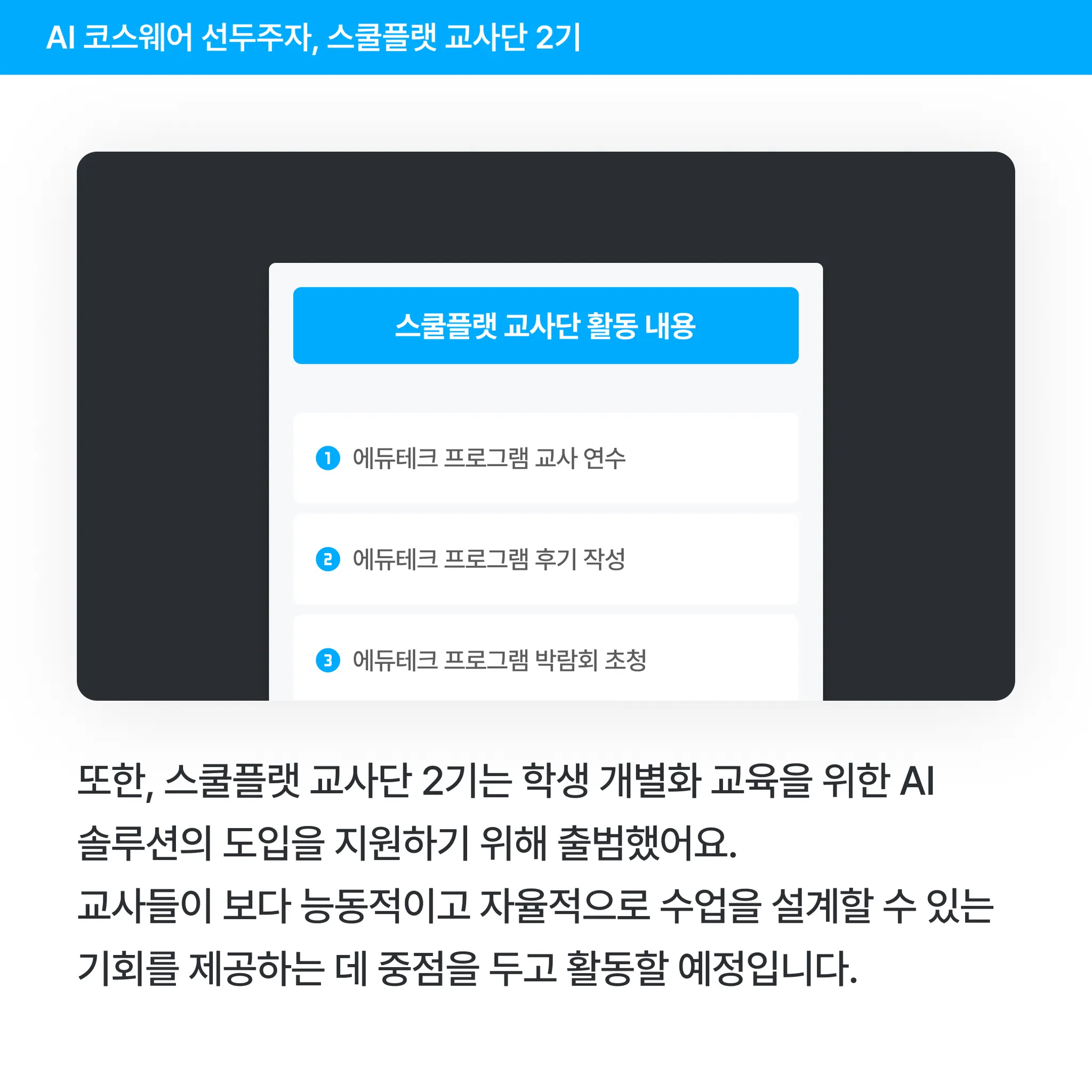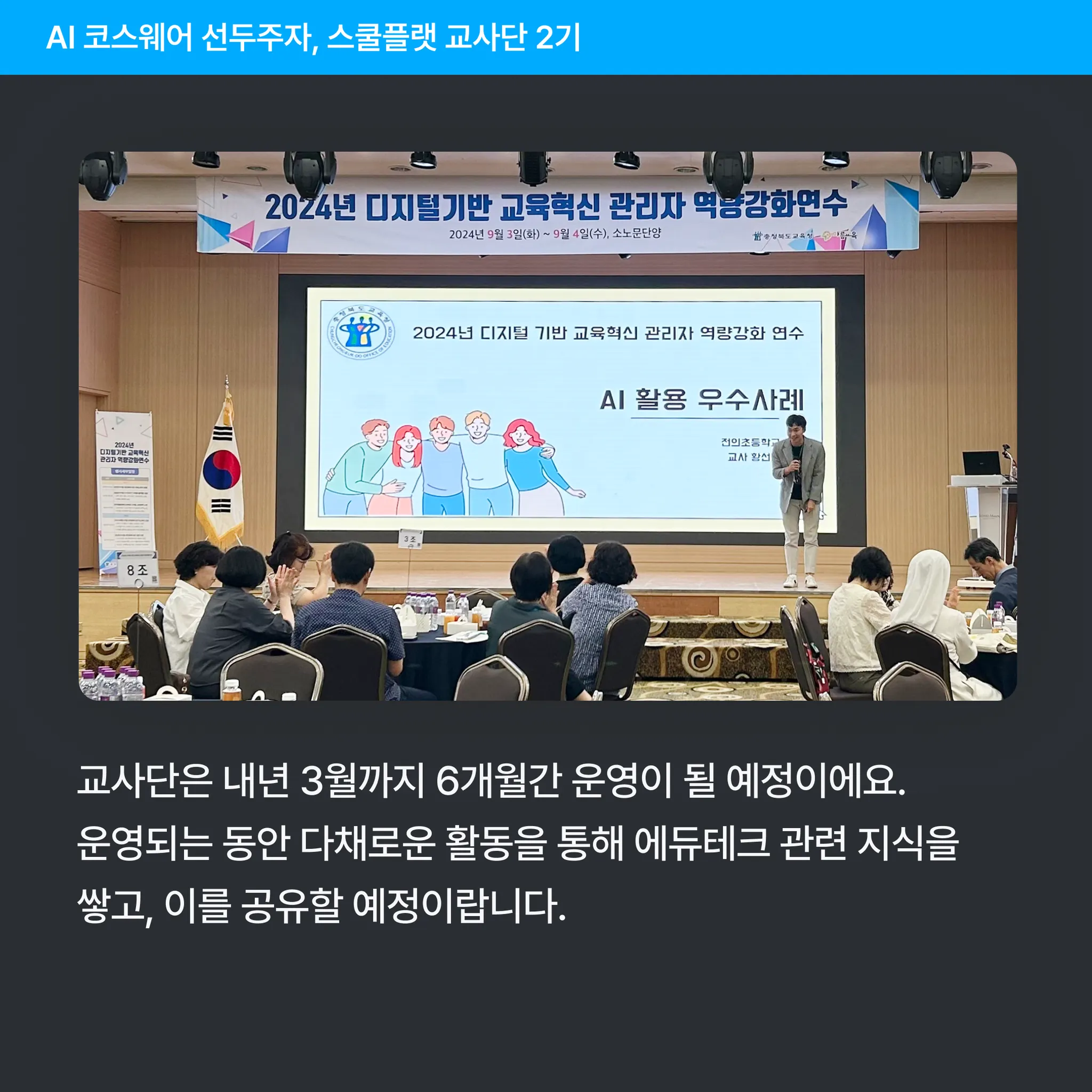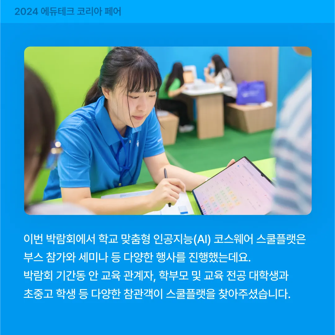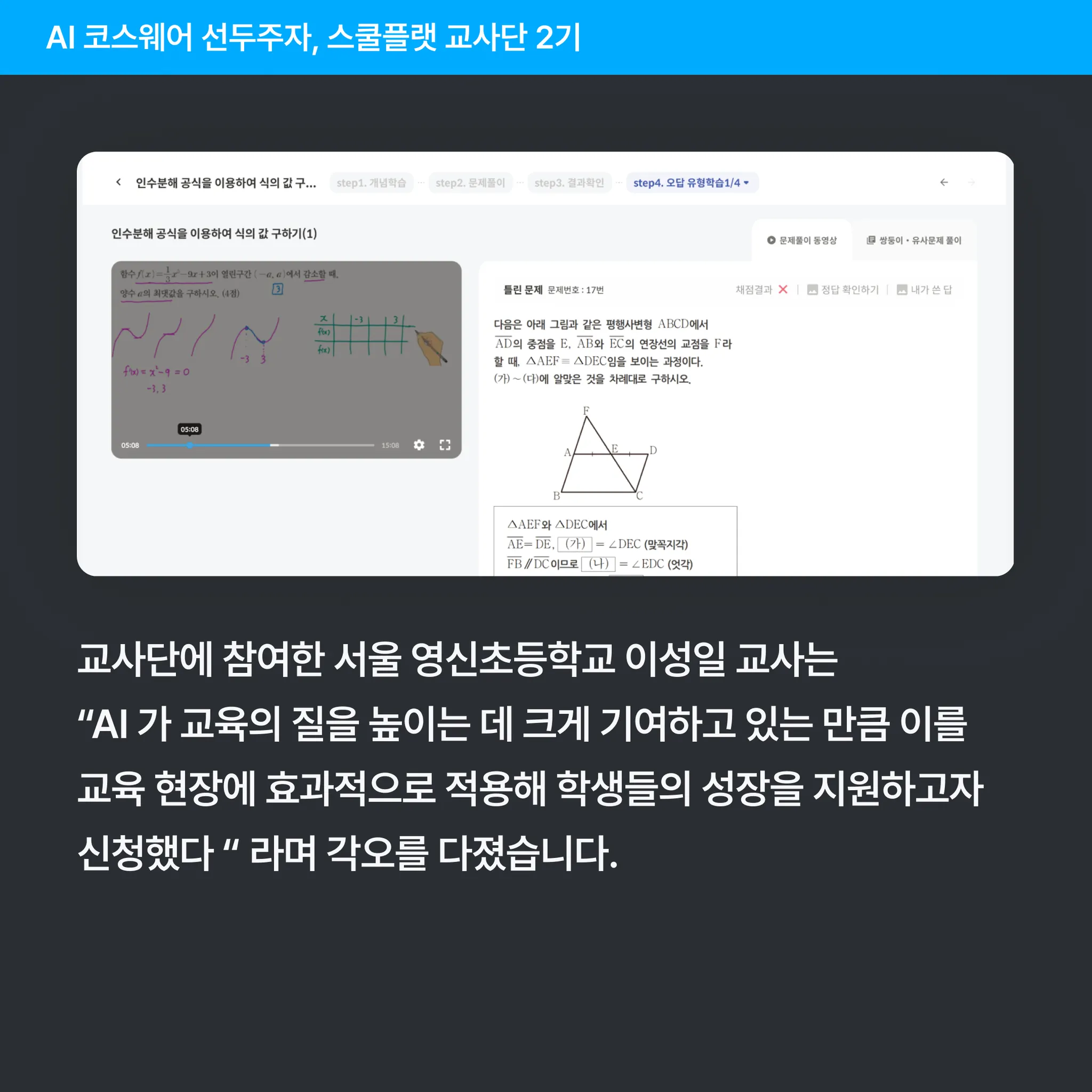 8월에 개최된 '에듀플러스 미래교육박람회'의 'AI 교사연수회'에서 열린 토론에서, 서울 염리초등학교 전혜리 선생님은 '디지털‧AI 수학과 수업 적용 사례'에 대해 경험 기반으로, 수학 과목에서 AI 코스웨어의 활용법과 장점을 자세히 설명해 주셨는데요. 전 선생님은 AI 코스웨어를 통해, 학생 맞춤형 문제 제공, 학생의 강점과 약점에 따른 교육, 그리고 누구나 활용할 수 있는 편리한 UX를 통해 학생 주도의 수업이 가능해졌다고 말씀하셨습니다.