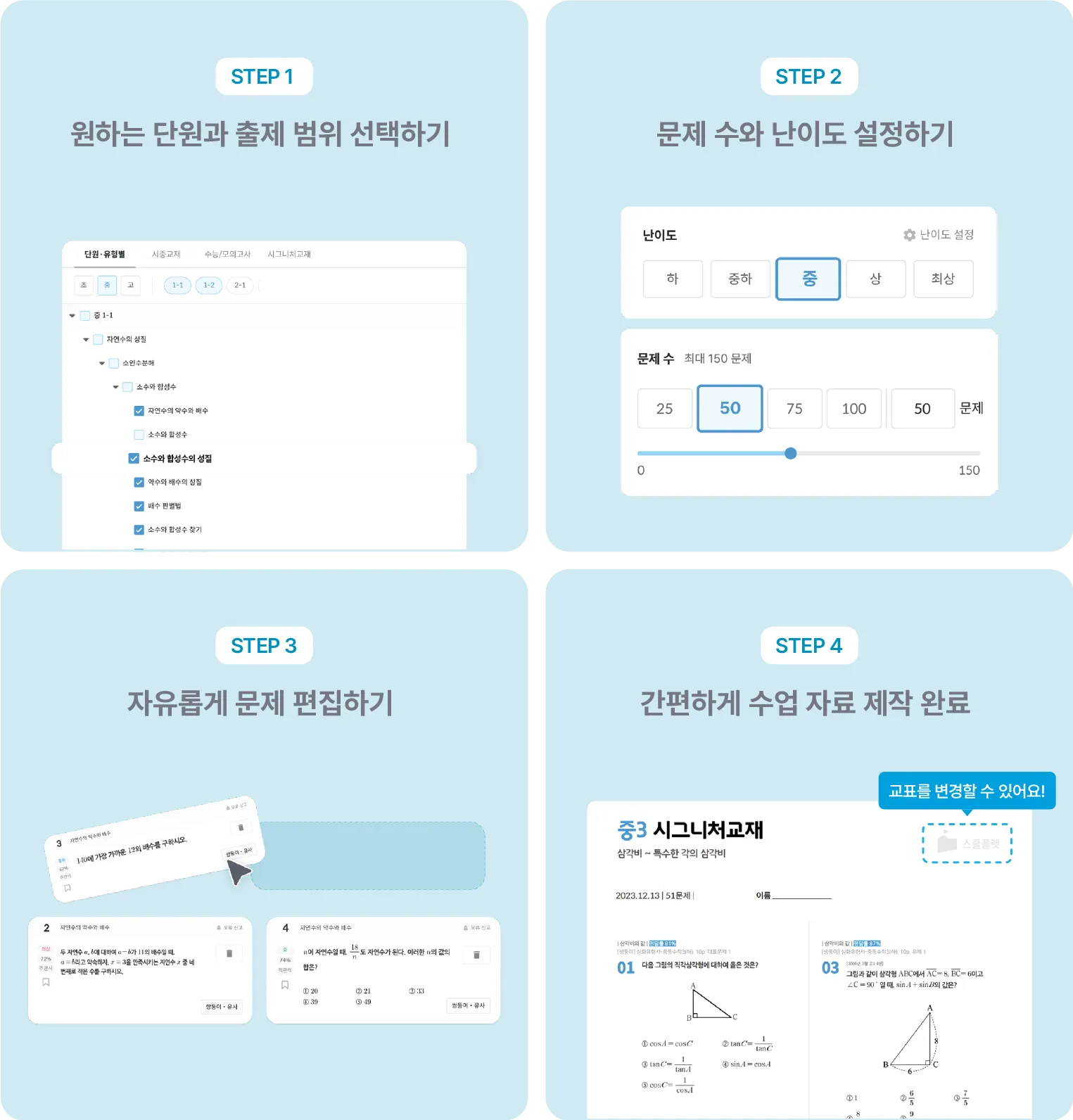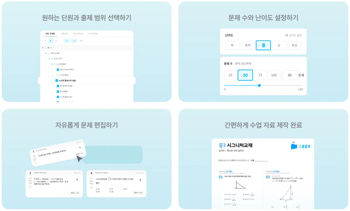 선생님은 여러 학생의 수업 현황과 개별 성취도를 대시보드에서 한눈에 확인하고, 데이터를 기반으로 개별 학습 상황을 관리할 수 있다. 기초학력이 부진한 학생에게는 수준에 맞는 집중 학습을 유도하여 학습 격차를 해소할 수 있다. 또한, 상위권 학생에게는 심화 학습을 유도하는 등 학생 별 수준에 따라 미리 설계된 코스웨어를 선택하면 문제를 보다 쉽게 출제할 수 있어 더욱 효율적인 수업 진행이 가능한 것이 특징이다.