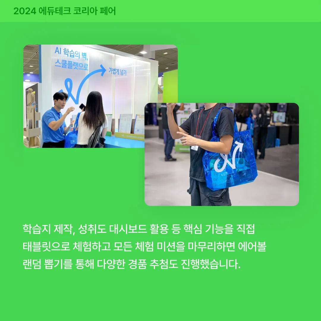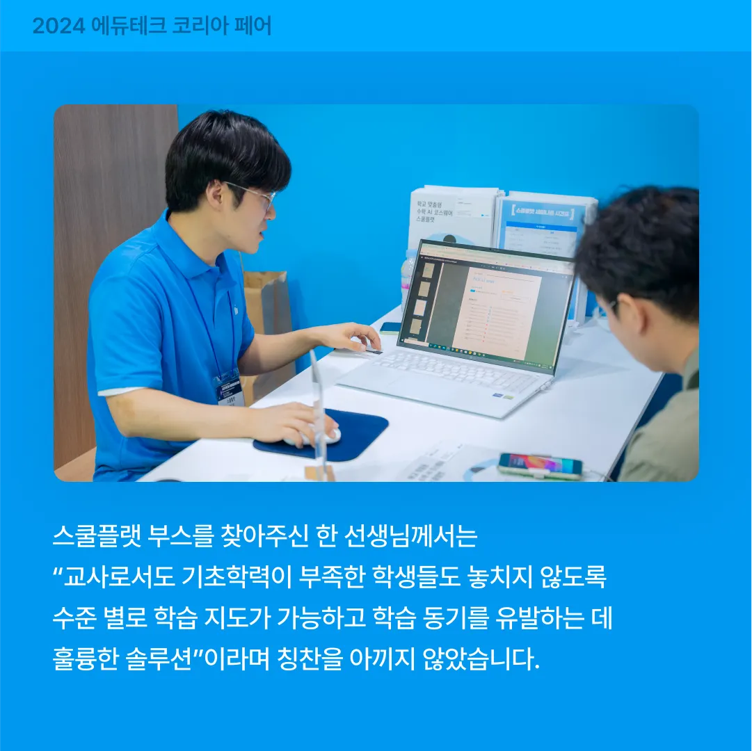 이번 행사에서 프리윌린은 학교 맞춤형 수학 AI 코스웨어 '스쿨플랫'을 선보이고, 현장 전담 매니저가 부스를 방문한 교원을 대상으로 ▲학습 대시보드 ▲코스웨어 학습 최적화 학생 앱 뷰 ▲교재 기반 코스웨어 라이브러리 기능 등 수업 운영에 최적화된 스쿨플랫의 모든 기능을 직접 시연하고 상세한 상담을 제공한다. 특히, 최근 주목받고 있는 ‘증거기반 에듀테크’의 개념을 충실히 반영한 스쿨플랫을 학교 현장에서 효과적으로 활용 가능하도록 적극 지원할 예정이다.