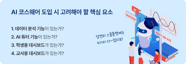 최근 몇 년 동안 원격 수업이 활발해지면서, 교실에 다양한 에듀테크 솔루션이 널리 확산되었습니다. 많은 선생님들이 기술을 활용하여 학생의 학업 성취도를 높이고 교육적 효과를 극대화하기 위해 여러 가지 시도를 하고 계신데요. 특히, 많은 선생님들 사이에서 수학이 AI 코스웨어를 가장 활용하기 좋은 과목으로 꼽히고 있습니다.