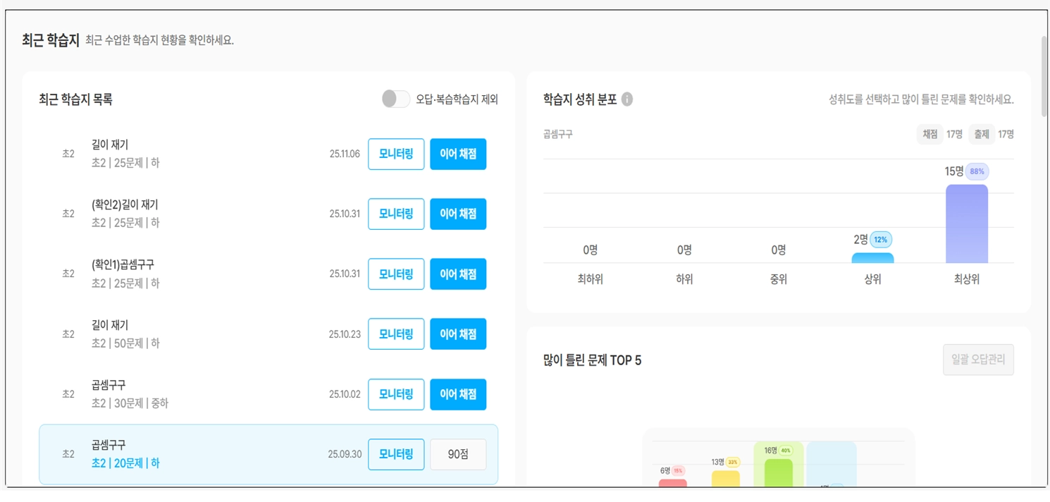 수업 후에는 대시보드로 전체 정답률, 자주 틀린 문제, 학습지 응시 현황을 한 눈에 확인했어요.