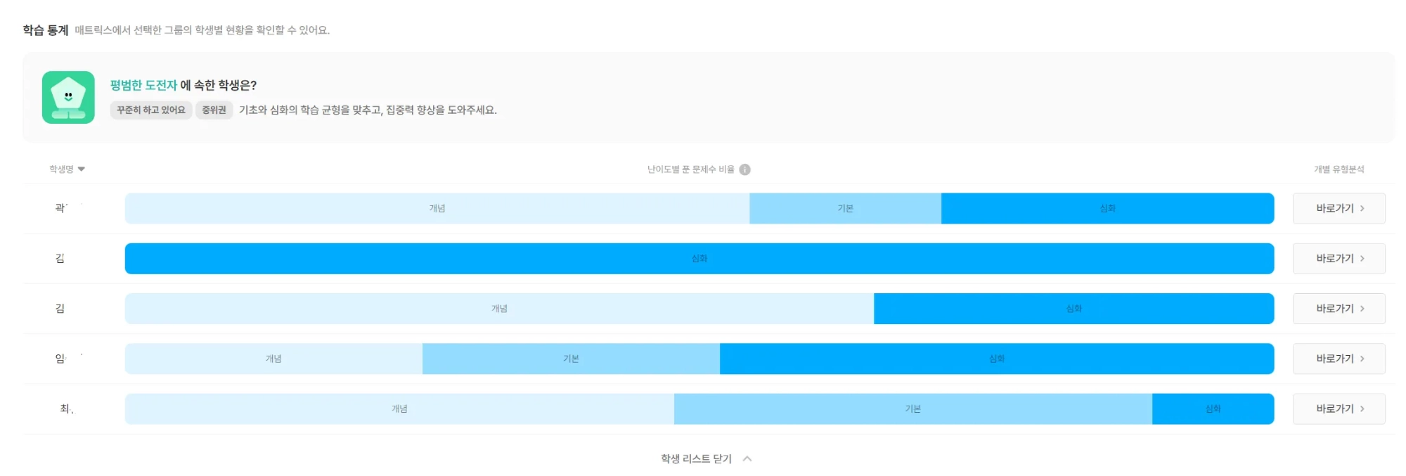 또 학생 스스로 자신의 수준을 판단하고 그에 맞는 문제를 선택해 끝까지 해결해보는 경험을 통해 학습의 주체로서 책임감과 자신감을 키우는 것이 목표에요.