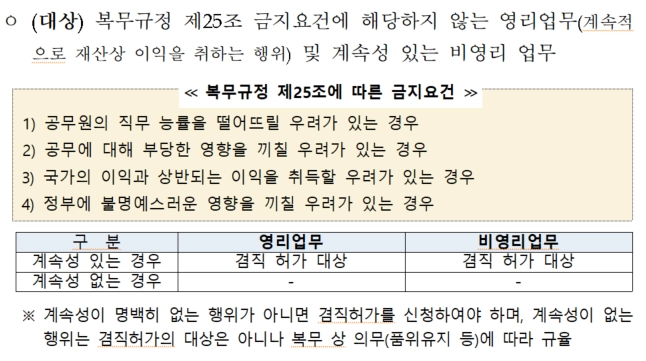 상기 조건에 해당하지 않는 경우, 「국가공무원 복무규정」 제26조에 따라 소속기관의 장의 사전 허가를 받아겸직 가능 (단, 영리행위가 아니더라도 계속성이 있는 비영리업무도 겸직 허가 대상이며, 계속성이 없는 일시적 행위는 겸직허가 대상이 아님