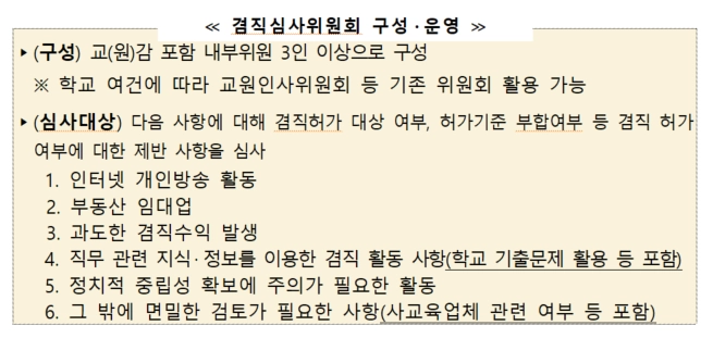 단, 사교육업체와 일부 관련성이 있더라도 겸직 목적의 공익성(에듀테크 업체에서 에듀테크 소프트랩 등 정부사업으로 이뤄지는 컨설팅, 디지털 교과서 개발, 교원연수자료 개발, 자문 등), 겸직 활동 결과물의 성격(학원 수강생 등 특정인이 아닌 대중에 판매·활용을 위한 것인지 여부 등)을 종합 고려하여, 겸직 허가 기준에 부합하는 경우에 한해 겸직 허가 가능